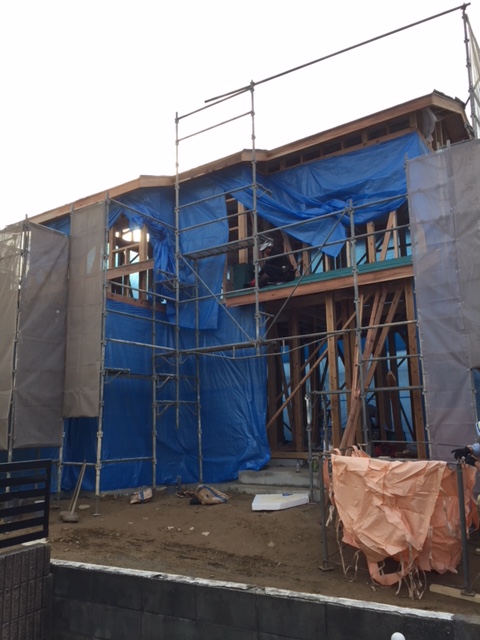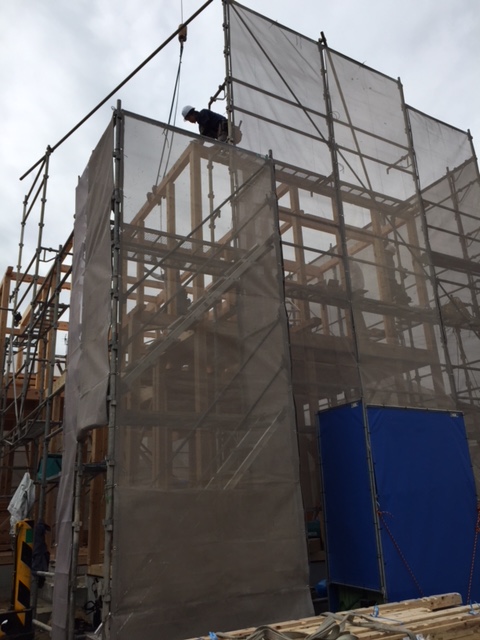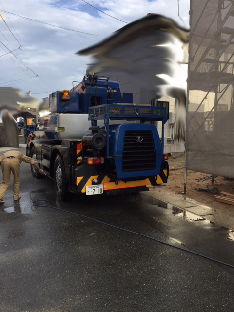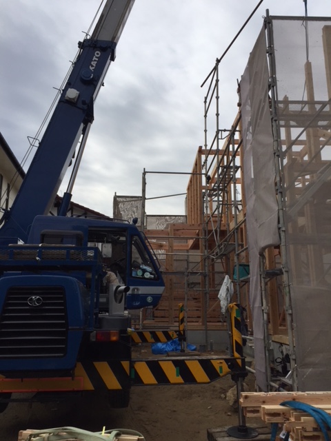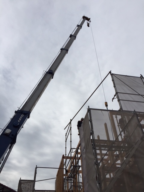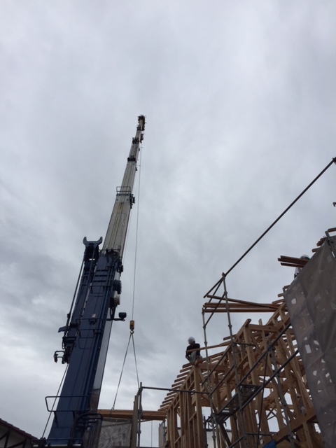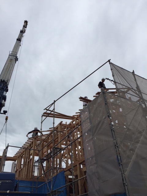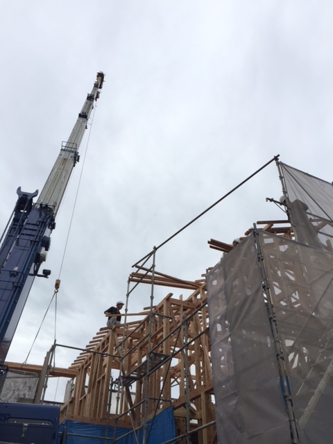 クレーン作業は終わり、屋根も組まれていて家の形をしています。
